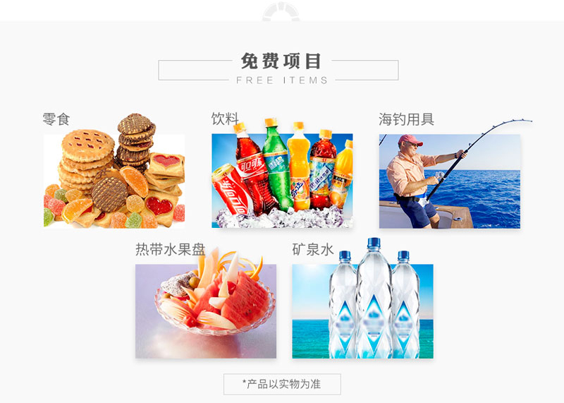 | 標配項目: | 飲料、茶點、水果、魚竿魚餌、酒具 | 影音設備: | |||||